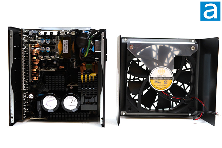 The fan model is Globe Fan S1202512MN, as shown in our photo above. The S1202512MN is a fluid dynamic bearing fan specified at 0.55A for a maximum speed of 2400 RPM, 109.44 CFM air flow, 4.59 mmH2O air pressure, and 41.2 dB of noise. The fan is not supposed to activate until the PSU is loaded to approximately 260W with semi-fanless mode active. As such, it should remain off for the most part, and even when it is on, the fan speed will vary with load. Fans with fluid dynamic bearings generally have much longer lifespans compared to sleeve bearing fans and is quite suitable for this application.
