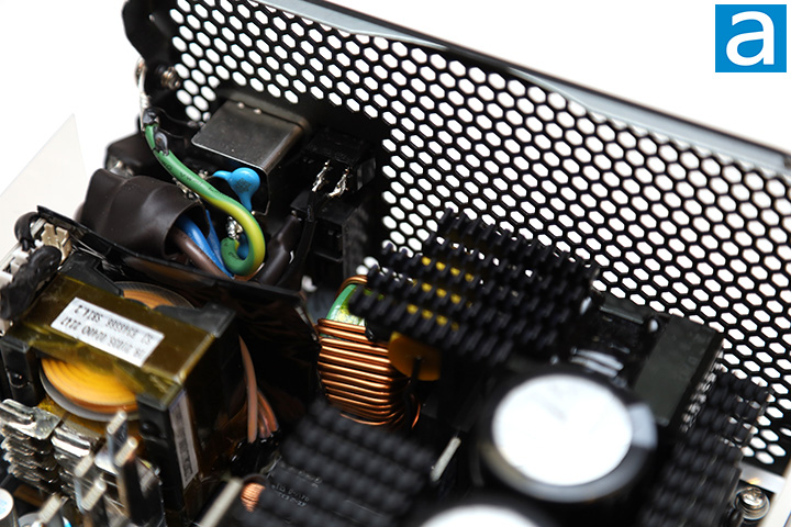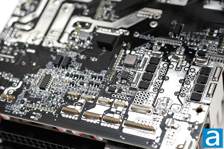 Eight Infineon BSC010N04LS MOSFETs are responsible for generating the +12V output, located at the back of the PCB, as shown. The BSC010N04LS's rated continuous drain current is 178A at 100c. It has an RDS(on) value of 1.0 mΩ maximum and 1.0 mΩ typical. Also found on the back is a Weltrend WT7527RA monitoring IC that provides over current and over/under voltage protection. The datasheets for all components mentioned in this review can be found on their respective manufacturers' websites.
