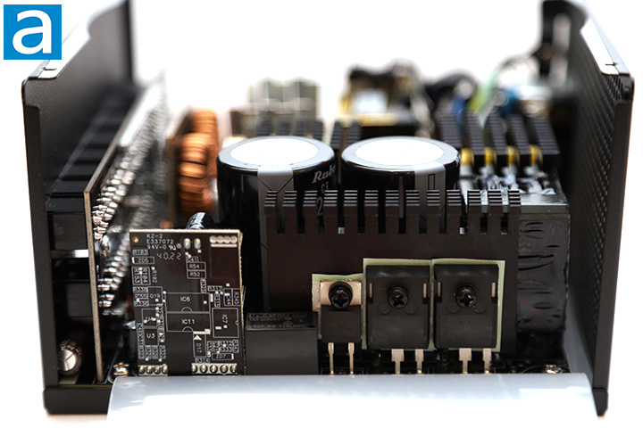 On the largest black painted heatsink shown in the above photo, there is one Toshiba TRS12E65F silicon carbide Schottky diode as the APFC boost diode attached to it. Meanwhile, on the same heatsink, there are two Infineon IPA60R060P7 power MOSFETs power transistors placed. Each is certified for up to 30A at 100c. These transistors present a maximum resistance of 60 mΩ and typical resistance of 49 mΩ when turned on according to the manufacturer's data sheet.