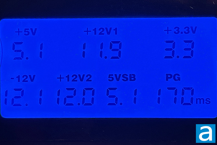 Voltages with minimal load are accurate, which is a basic requirement of power supplies out of the box. This power supply is ATX 3.0 compliant and officially supports Alternative Sleep Mode with 100 to 150ms PG specifications, so it looks like the PSU tester I used was not fast enough to pick up the true PG signal. The ATX design specifications state a PSU's PG is required to be between 100ms and 500ms, with 250ms maximum for Non-Alternative Sleep Mode and 150ms for Alternative Sleep Mode.
