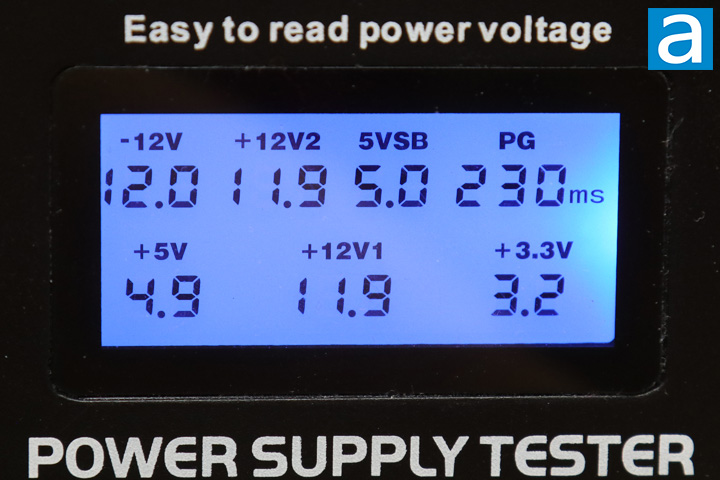 Voltages with minimal load are generally accurate, which is a basic requirement of power supplies out of the box. In this situation all are within 4%. The PG (Power Good) delay seems to be well within its rated range and general power supply standard at 230ms.
