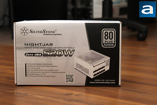 The SilverStone Nightjar NJ520 520W continues the tradition of a practically black and white retail box since the original ST30NF back in 2004. At first, I thought this color scheme had to do with its 80 PLUS Platinum certification, but the company assured me it has nothing to do with it. A proper coincidence? Anyway, at the top, we can see SilverStone's logo and slogan, while the lines "Nightjar" and "Ultimate fanless power supply with 80 PLUS Platinum" occupies a prominent region in the center. Its wattage capacity is written in super large font, along with the zero dBA badge. A photo of the power supply at 3/4 angle can be seen adjacent to the list of feature highlights. On the right, a large 80 PLUS Platinum badge ensures you know this is an 80 PLUS Platinum certified power supply, just in case you could not tell by everything else on the box already. Specifications, performance graphs, and features can be found on remaining sides of the box.