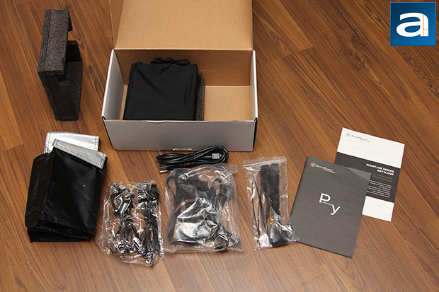 The SilverStone Nightjar NJ520 520W's retail packaging can be opened by two notches attached in front. Upon opening the flap top box, you will find everything neatly organized. The power supply is located on the left between two Styrofoam brackets held inside a soft drawstring bag, and almost everything else inside a double pocket, Velcro sealed nylon bag. There is also an instruction manual as well as a specifications booklet out in the open. The instruction manual is highlighted with the letters "PY" in front, just like the SilverStone Strider Gold S ST85F-GS 850W and SilverStone Strider Essential Gold ST70F-ESG 700W; as if my colleague Preston Yuen has initialed yet another one from the factory. (It is really a stylized presentation of the words "power supply", maximizing its first and last letters.) Out of the box, you will receive the NJ520 power supply itself, two pieces of literature as aforementioned, modular cables, AC power cable, and a bag that contains some zip ties, Velcro straps, and five standard Philips head screws.