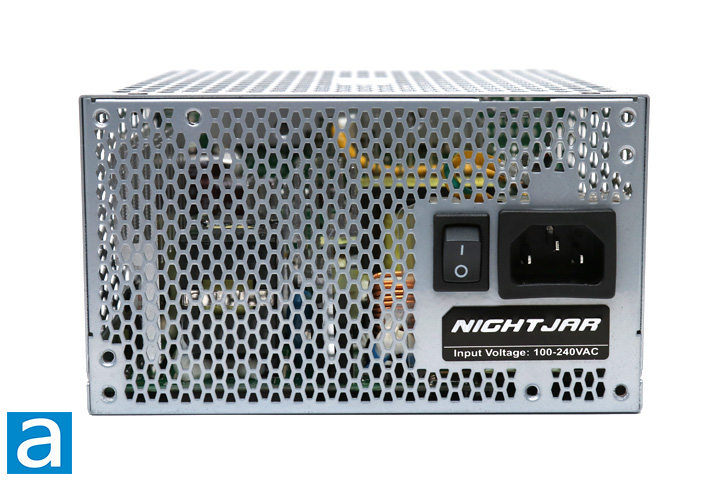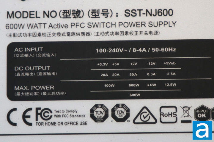 The voltage specification label for the SilverStone Nightjar NJ600 600W is on the bottom side of the unit. There are two main virtual rails. Up to 20A can be delivered via the +3.3V rail for a total of 66W. The +5V rail can deliver 20A too, bringing the output to 100W in this area. The total combined output for the +3.3V and +5V rail is 100W. In other words, your power allocation combination must fall within the limits of the listed specifications. Meanwhile, a single powerful +12V rail delivers up to 50A (600W) to reduce operating overhead compared to multiple +12V rails. Overall, the combined power output for the whole Nightjar NJ600 600W is an unsurprising 600W. Again, your power distribution in your system must fall within the limits provided -- it must not exceed 66W on the +3.3V rail, 100W on the +5V rail and 100W combined for both, 600W on the +12V rail, and 600W combined between the positive rails. All these confusing numbers aside, this configuration allows for flexible power demands. It should be sufficient to accommodate most users and the overall distribution is pretty reasonable for a 600W power supply.