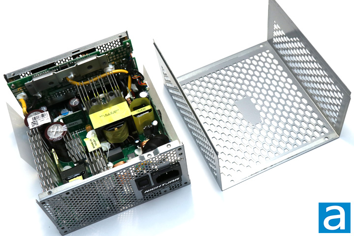 As we usually do, we opened up the SilverStone Nightjar NJ600 600W power supply to take a closer look at what is going on inside. Opening up this power supply will void your five-year warranty, as the warranty seal covers one of the screws. For your benefit, we voided our warranty on this unit so you do not need to. There are zero user serviceable parts inside anyway. Removing the top shell from the power supply is pretty easy, as we just remove the four screws at the top. As we have mentioned on all of the pages up to this point, the OEM for the SilverStone Nightjar NJ600 600W is Seasonic, as this unit is based off their PRIME 600 Titanium Fanless unit. The photo above shows an overhead view of its internal components, with the layout being exactly the same as the PRIME Fanless. Build quality looks good on first glance with very few globs of glue around the unit. Seasonic makes some of the best power supplies, so we will see how this affects the build quality. Otherwise, there are many heatsinks found around the unit in a natural silver finish.