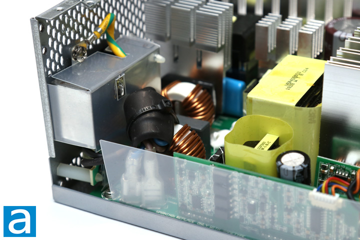 On the secondary side, we can see more Japanese brand capacitors from Nippon Chemi-con and Nichicon, all rated at 105c. As with modern high efficiency power supplies, all rectifiers produce the +12V out -- while the +5V and +3.3V outputs are generated from the +12V output using a DC to DC converter within the power supply unit. Most of these secondary components are actually hidden under a metal heatsink on the backside of the rear panel, with several thermal pads to aid in dispersing heat. This includes the ANPEC APW7159 synchronous buck PWM controller and six Infineon BSC0906NS MOSFETs responsible for generating the +5V and +3.3V outputs. The BSC0906NS's rated continuous drain current is 40A at 100c and a pulsed drain current of 252A. Drain source voltage is rated at 30V and a RDS(on) value of 0.0045 ohm maximum and 0.0038 ohm typical. Underneath the main board, four Infineon BSC014N04LS MOSFETs are responsible for generating the +12V output. The BSC014N04LS's rated continuous drain current is 40A at 100c and a pulsed drain current of 100A. Drain source voltage is rated at 40V, and a RDS(on) value of 0.0014 ohm maximum and 0.0011 ohm typical. These too are passively cooled with thermal pads in contact with the metal enclosure. Meanwhile, a Weltrend WT7527V IC is located on a side daughterboard, and it provides over/under current and over/under voltage protection. The datasheets for all components mentioned in this review can be found on their respective manufacturer's websites.