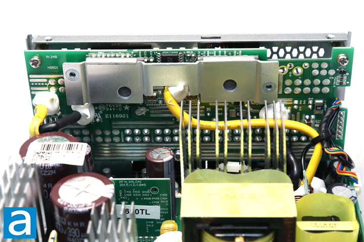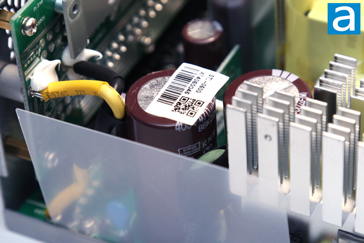 On the primary side, there are two Nippon Chemi-Con capacitors connected in parallel. One has a rating of 470uF at 400V while the other has a rating of 390uF at 400V. This makes for a total capacitance of 860uF. Both of these capacitors also have temperature ratings of 105c. It is great to see Japanese capacitors here, though it is not a huge surprise, as Japanese capacitors generally provide better reliability and boast a longer lifetime. A higher 105c temperature rating is also great to see, as some cheaper capacitors are only rated at 85c.