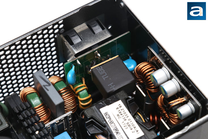 The transient filter stage is the first input stage of any computer power supply, so we will take a closer look at this first. From here, there are several ferrite coils and one metal oxide varistor. A single X-capacitor and two Y-capacitors are placed at the AC receptacle, while another additional set of one X- and two Y-capacitors are found on the main board. In total, this is more than twice the amount of X and Y capacitors recommended, which is great to see. In addition, the MOV being present here is good, as they are intended to protect your power supply from AC line voltage spikes. A CMD02X IC also exists here to prevent current flow when AC is disconnected.