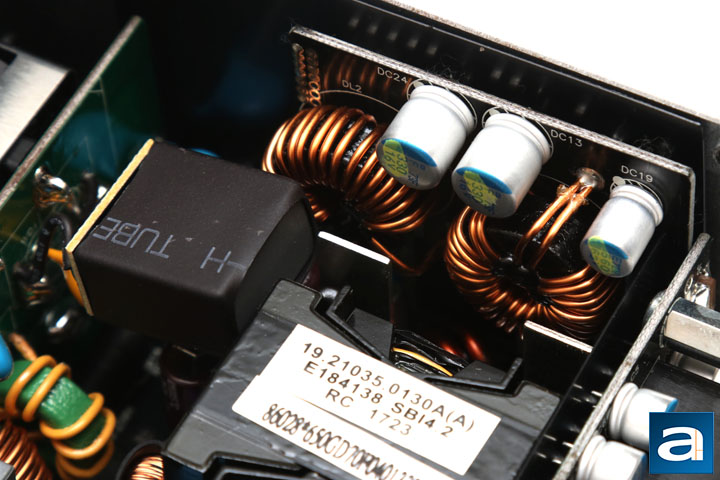 On the primary side, there is one Rubycon capacitor. It is rated at 470uF at 420V. It has a temperature rating of 85c. It is great to see Japanese brand capacitors here, as some cheaper units have capacitors made from Taiwan or China. On the other hand, I would have wished Sirfa put a higher 105c temperature rating capacitor here, as they generally boast a longer lifetime. In addition, an A6069H current mode control PWM regulator IC can be found under the main capacitor.