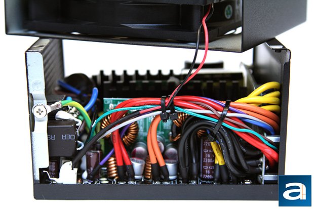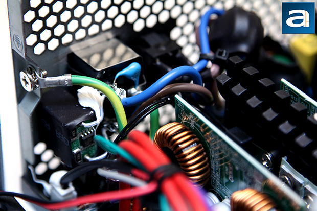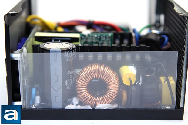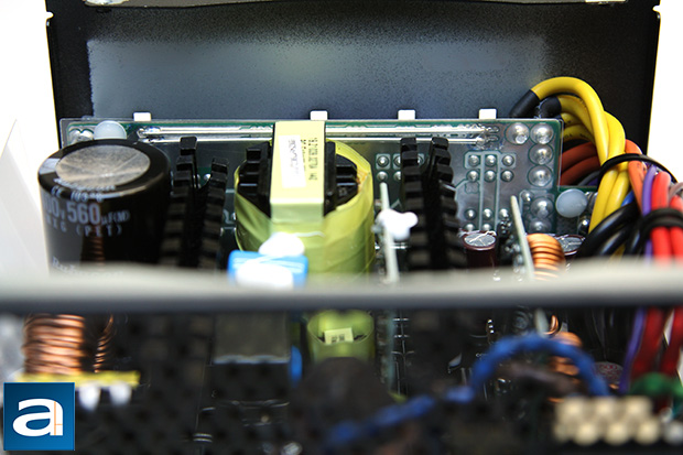 On the primary side, we can see one Japanese brand Rubycon capacitor. Japanese brand capacitors are usually what we expect from something in this price range, so this is nothing surprising. Our 750W second revision of SilverStone's Strider Gold S series incorporates one 560µF x 400V capacitor. This unit is rated at 105c; whereas more value oriented power supplies usually use 85c rated capacitors.