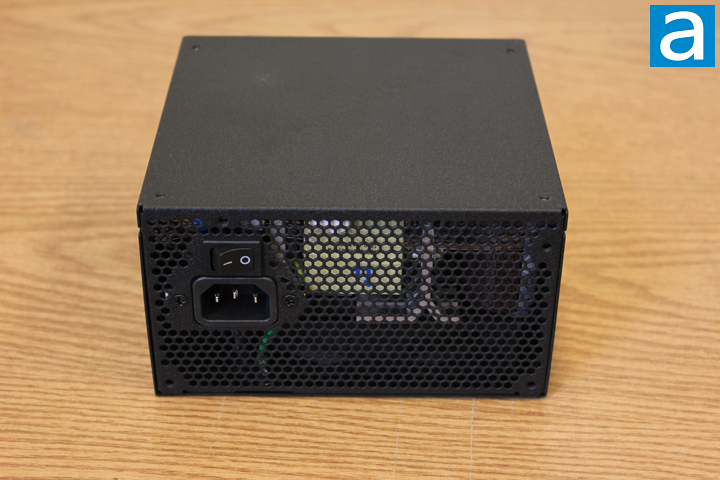 Now, let us move on to the exposed side of the power supply unit. In the photo, we can see the power input and switch. The power input plug is standard; therefore, the user can just reuse a power cord from other equipment if necessary. Do make sure the power cord is of appropriate thickness though -- SilverStone recommends one that is at least 16 AWG, and the one included from the box is 14 AWG. The rest of the front side panel features a grille for cooling. Cool air can be pumped into the power supply unit from the grille at the bottom. After cooling down the internal components, hot air can then be discharged through the front grille. To install the power supply unit in a computer case, there are four screw holes at the front of the PSU as expected.