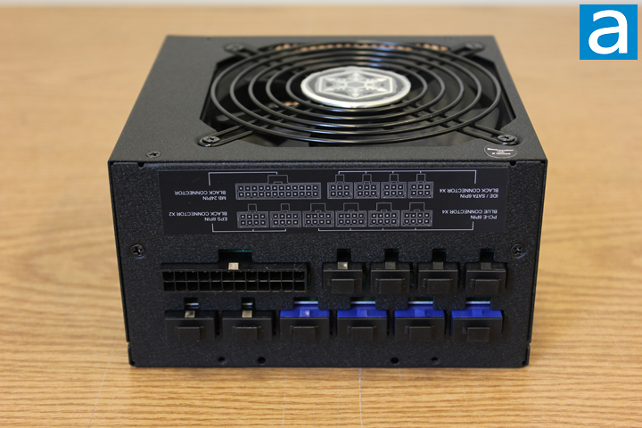 At the back of the power supply unit is the connection panel. The sockets are easy to use thanks to the labels on the panel with two rows of connectors. On the right hand side of the panel in the above photo, there are four peripheral power outputs. All the four sockets are grouped together. To the left of the peripherals section, there is an ATX 24-pin socket for the motherboard power supply. Right below the ATX 24-pin socket, there are two 8-pin CPU output sockets for the ATX 4+4 connections. The four sockets in blue are for PCI Express connectors. Thanks to the good design of the sockets, it is not possible to plug cables into the wrong connectors. For example, the user cannot plug the ATX 4+4 pin to the PCI Express output, even though they look similar in terms of pin layout.
