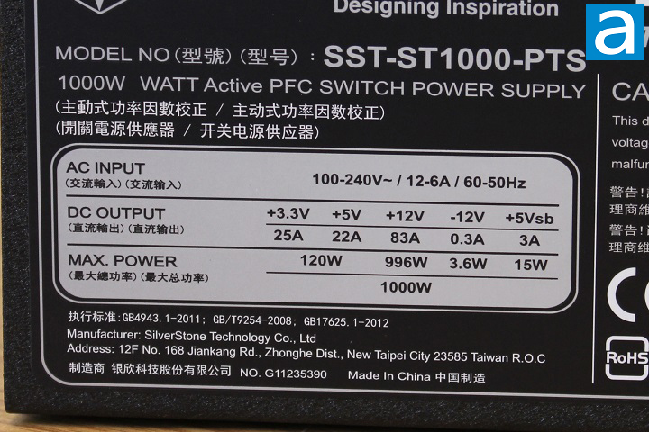 The voltage specification label for the SilverStone Strider Platinum ST1000-PTS 1000W can be found on the top panel. Despite the fact that this product features a single rail design, there are two main virtual rails. Up to 25A can be delivered via the +3.3V rail for a total of 83W. The +5V rail can also deliver 22A, which is 110W. The total combined output for the +3.3V and +5V rail is 120W. In other words, your power allocation combination must fall within the limits of the listed specifications. Meanwhile, a single powerful +12V rail delivers up to 83A (996W) to reduce operating overhead compared to multiple +12V rails. Overall, the combined power output for the whole Strider Platinum ST1000-PTS is 1000W. Again, your power distribution in your system must fall within the limits provided -- it must not exceed 83W on the +3.3V rail, 110W on the +5V rail and 120W combined for both, 996W on the +12V rail, and 1000W combined between all the positive rails. Generally speaking, the power distribution of this product is fairly reasonable for a 1000W power supply unit.