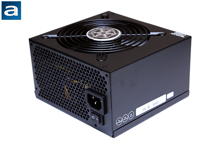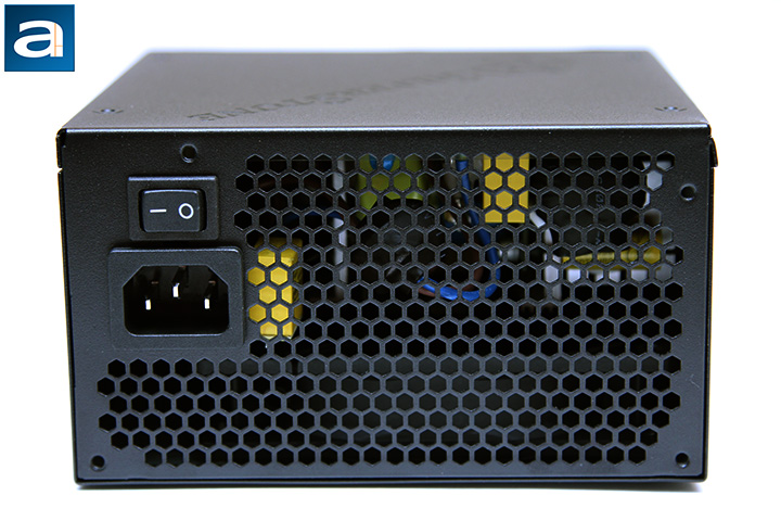 Starting from the back part of the power supply, we have the same familiar honeycomb mesh design like most PSUs with bottom mounted fans; and the standard on/off switch located above the male connector for power input on the western edge. The low resistance honeycomb mesh design is implemented to maximize airflow and minimize air resistance. This is done as heat needs to leave the power supply as easily and efficiently as possible, because the Strider Platinum ST75F-PT 750W incorporates only one 120mm fan at the bottom, with no auxiliary fans. It is also implemented in a reasonably efficient manner, as these components take up minimal amounts of room at the back. This is not to mention this PSU is designed to deliver up to about 100W without activating the internal fan. As with most new power supplies, the SilverStone Strider Platinum has an automatic full range (100V-240V) AC line voltage selection, so the user does not have to worry about manually selecting input voltage.