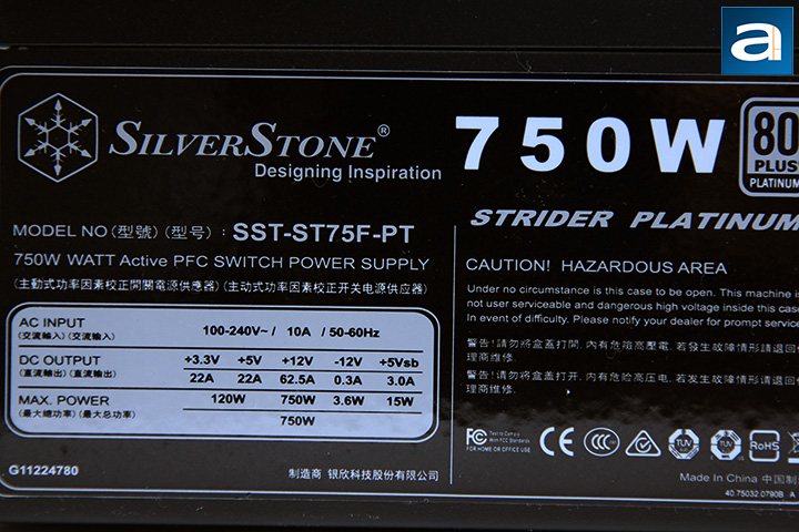 The SilverStone Strider Platinum ST75F-PT 750W is 80 PLUS Platinum certified, which means that it is certified to be at least 90%, 92%, 89% efficient at 20%, 50%, and 100% load, respectively. Higher certifications available for power supplies of this type include 80 PLUS Titanium at press time.