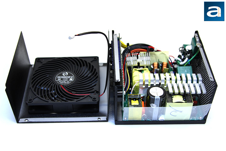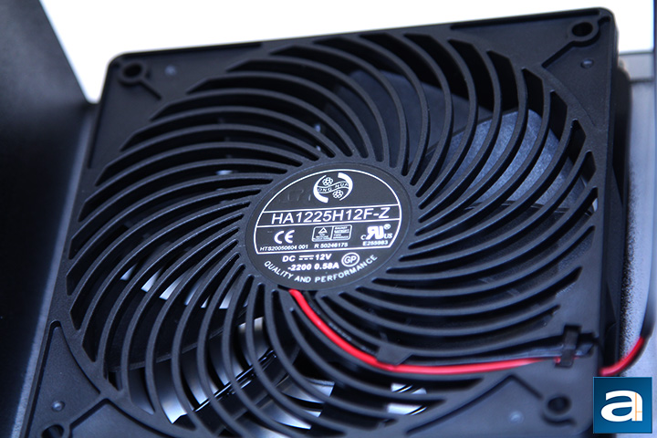 Lastly, we see a 120mm fan that provides cooling to the SilverStone Strider Titanium ST80F-TI 800W's internal components. It is connected to the mainboard using a 2-pin connector. A 120mm fan is rather small nowadays for a power supply with a bottom mounted fan, but if not a lot of heat is being generated, it should not be much of an issue. Please note the Strider Titanium's cooling system is not semi-passive, because in order to meet this certification grade, the power supply needs to be very efficient at low loads. A 120mm fan is used to keep the enclosure as small as possible, considering the Strider Titanium is only 150mm deep. Ong Hua is the fan OEM, with HA1225H12F-Z as the model number, as shown in our photo above. Further research indicates the HA1225H12F-Z is a fluid dynamic bearing fan specified at 0.58A for a maximum of speed of 2200 rpm. Fans with fluid dynamic bearings generally have much longer lifespans compared to sleeve bearing fans, and is quite suitable for this application.