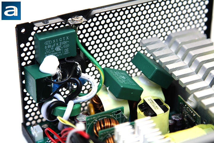 A quick tug on the shell, and we got straight to the internal inspection. The transient filter stage is the first input stage of a computer power supply, so we will take a look at that first. SilverStone has always done a great job in the past to make sure their power supplies met or exceeded the recommended requirements, and the Enhance based ST80F-TI is no exception. The SilverStone Strider Titanium ST80F-TI 800W has two ferrite coils, one metal oxide varistor, four metalized polyester X-capacitors, and two ceramic Y-capacitors. This is four times the amount of X capacitors than recommended. Considering how many modern day PSUs have missing MOVs, I am happy to see it here, as this component is used to stabilize spikes from the AC line. A Sanken A6069H current mode control PWM regulator IC for controlling standby power can be spotted as well.