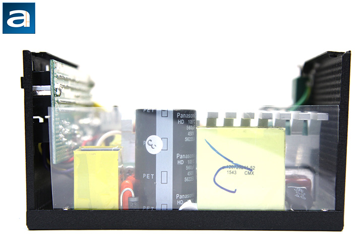 On the primary side, we can see one Japanese brand Panasonic capacitor. Japanese brand capacitors are usually what we expect from something in this price range, so this is nothing surprising. Our 800W version of SilverStone's Strider Titanium series incorporates one 560µF x 450V capacitor. This unit is rated at 105c; whereas more value oriented power supplies usually use 85c rated capacitors.