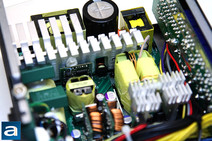 On the secondary side, we can see more Japanese brand capacitors from Nippon Chemi-Con and Rubycon rated at 105c. As with modern high efficiency power supplies, all rectifiers produces the +12V out -- while the +5V and +3.3V outputs are generated from the +12V output using a DC to DC converter within the power supply unit. In the middle are two add-in printed circuit boards, each with one ANPEC APW7073 synchronous buck PWM controller. One Infineon BSC050NE2LS and one BSC018NE2LS MOSFET on each board are responsible for the conversion process. The BSC050NE2LS's rated continuous drain current is 37A at 100c, and a pulsed drain current of 232A. Drain source voltage is rated at 20V, and a RDS(on) value of 0.005 ohm maximum and 0.0042 ohm typical. The BSC018NE2LS's rated continuous drain current is 97A at 100c, and a pulsed drain current of 400A. Drain source voltage is rated at 20V, and a RDS(on) value of an impressive 0.0018 ohm maximum and 0.0015 ohm typical. One chip by PFC Device Corporation labeled PFR10V45LT can be seen near the two add-in PCBs, but I cannot find any information on this specific product online. An educated guess is it is an MOS Schottky rectifier. The datasheets for all components mentioned in this review can be found on their respective manufacturer's websites.