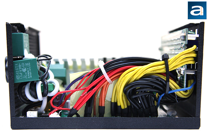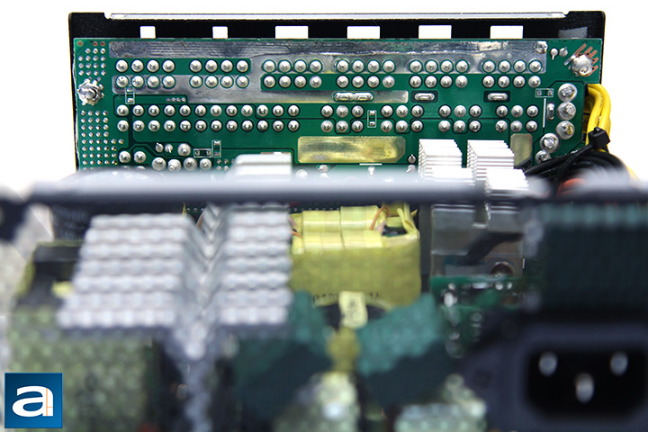 At the back, we have a large daughterboard covering the entire rear panel for the modular cable sockets. There is nothing special going on here electrically; all sockets are connected to the main circuit board after the secondary stage by a bundle of wires. The output connector configuration can be seen on the previous page. Overall, the internal build quality of SilverStone's Strider Titanium ST80F-TI 800W power supply is excellent -- something we would expect from what we have seen from the company in the past. Components are arranged pretty well for optimal cooling with minimal wires running around inside, and solder points on its green PCB is quite clean in general. I would say the SilverStone branded, Enhance built ST80F-TI is generally very good with regards to the selection of components used under the hood.