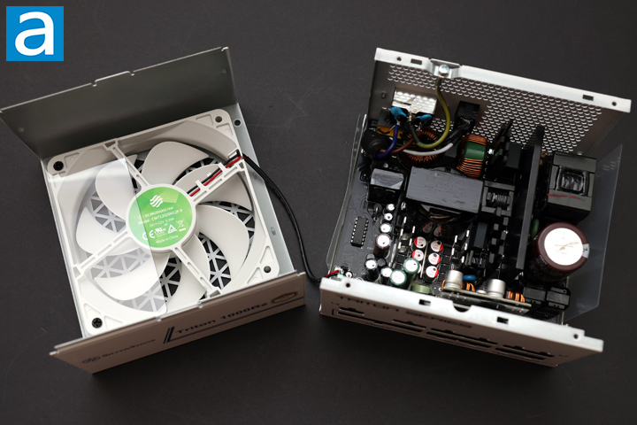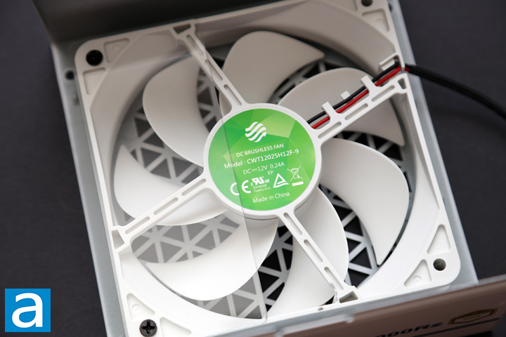 The fan in the SilverStone Triton 1000Rz 1000W is marked as a CWT 12025H12F-9 fan, and connects to an add-in board with a 2-pin connector. This is controlled by a STMicroelectronics ST69345 IC. This is a 120mm fan, which is a bit small for a power supply of this wattage, but it is the largest you can fit into something that is 14.0mm deep. Otherwise, this is a fluid dynamic bearing fan that operates at a maximum of 2300RPM and 0.24A. Fans with fluid dynamic bearings are quieter and have much longer lifespans compared to sleeve bearing fans, making it quite suitable for this application.