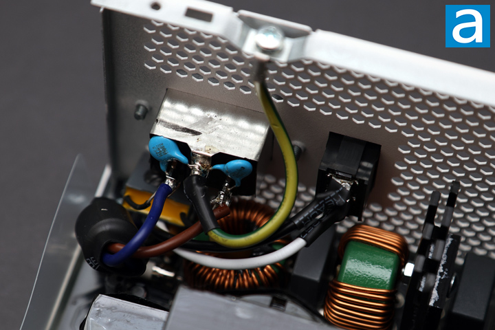 If we start at the transient filter stage, there is a total of two X-capacitors and four Y-capacitors near or around the AC receptacle. This is two times the amount of X and Y capacitors necessary, which is nice to see. In addition, we have two ferrite coils, a NTC thermistor, and a metal oxide varistor. The MOV helps with suppressing voltage spikes.