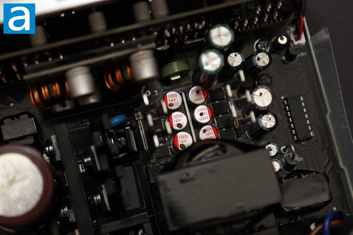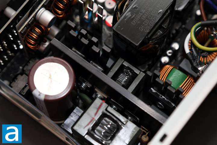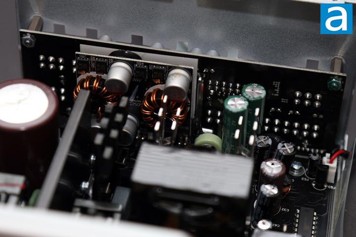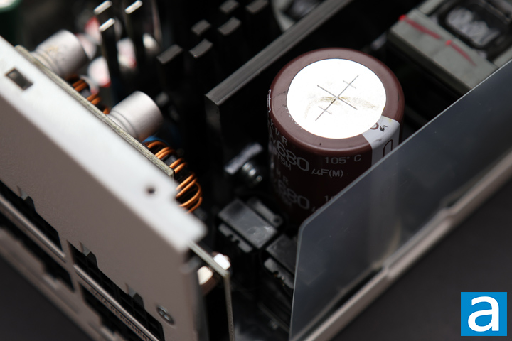 On the primary side, there is one Japanese-made Nippon Chemi Con KMR capacitor. It is rated for 680µF x 400V. It is rated at 105c, whereas more value-oriented power supplies often use 85c rated capacitors. The active PFC circuit featured on the SilverStone Triton 1000Rz 1000W uses two Diodes Incorporated GBU1006 bridge rectifiers on one side of the large primary heatsink. At 115V, the maximum rectified forward current capacity with heatsink is 10A each, so you can theoretically pull up to 2300W (10A * two diodes * 115V) from the bridge rectifier at 100% efficiency. Of course, this is limited by the fact that it is not 100% efficient and neglects the fact that not every component in the system is able to keep up.
