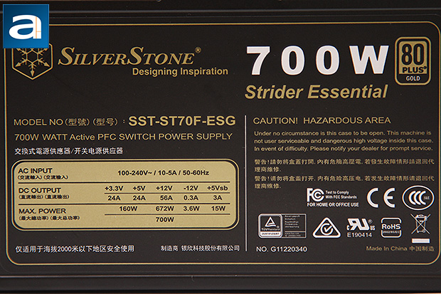 The SilverStone Strider Essential Gold ST70F-ESG 700W is 80 Plus Gold certified, which means that it is certified to be at least 87%, 90%, 87% efficient at 20%, 50%, and 100% load, respectively. Higher certifications available for power supplies on this type include 80 Plus Platinum and 80 Plus Titanium at press time.