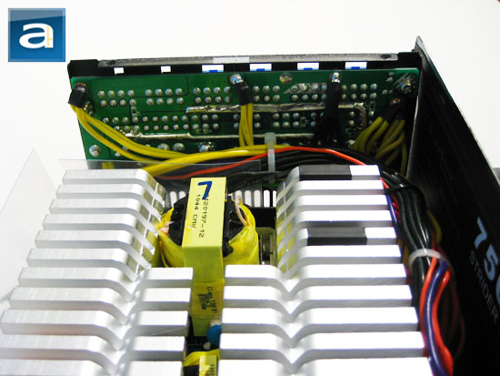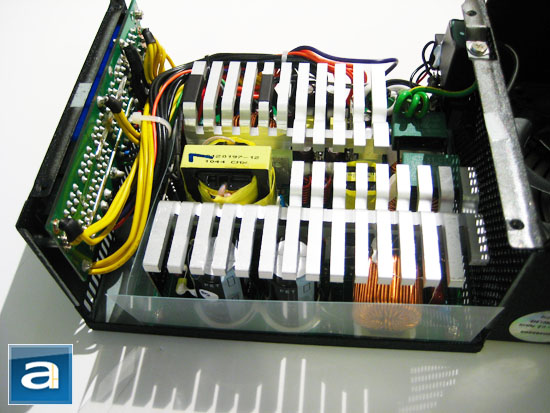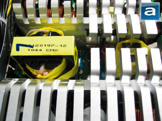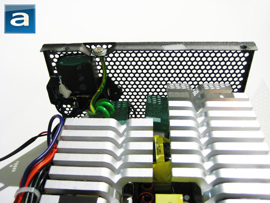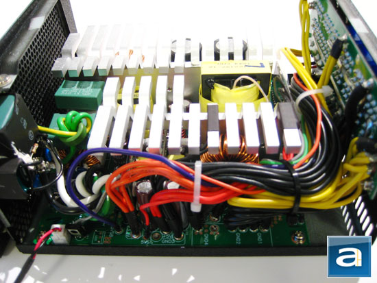 Included beneath the large heatsink arrays are various copper ferrite coils, bridge rectifiers, X and Y capacitors, miscellaneous capacitors, and fan control thermistor. Unlike some lower end Thermaltake designs I have seen in the past, there are no random globs of plastic over components, or at the very least, they have been hidden well by the overshadowing heatsinks.