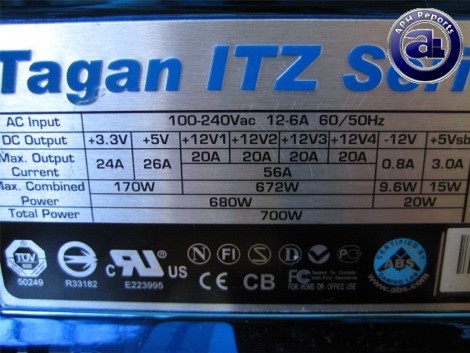 As noticed earlier on the retail packaging as well as the fan grill as shown in the photo above, Tagan has been working with ABS gaming systems to bring about the ITZ series power supplies -- to indicate it as 'ABS certified'. Likely more of a marketing aspect than performance indication, however -- because Tagan already holds a strong reputation for high performance power supplies as far as most people are concerned.