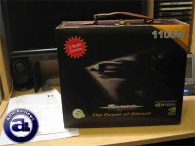 Opening the shipping box reveals retail packaging of the Tagan TurboJet 1100W. Where my initial guesses include something other than a single power supply, in reality there is nothing more than a single power supply. As the old saying in the computer world goes, the heavier the power supply, the better. (This speculation is usually backed up by usage of higher quality components inside the power supply unit to supply better and cleaner power.)