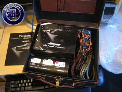 If packaging is any indication of superiority, the Tagan Turbojet 1100W's included briefcase definitely is something to take a look at. Yes, a briefcase with copper locks and cushion padding on the side. Inside the briefcase are the power supply, cables leading out of the unit, as manual and a batch of accessories and connectors. The manual is pretty detailed in describing each pin on different connectors as well as a general installation tutorial.
