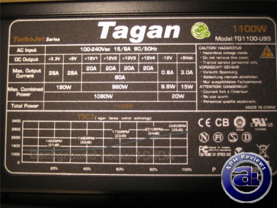 The specifications on the right side of the Tagan Turbojet 1100W power supply. The +3.3V and +5V line each provides up to 28A of power each (180W total), while the four independent +12V rails provide 20A of power each (Total 80A and 960W). That's 1080W and the remaining 20W is set off to the -12V and +5Vsb for 9.6W and 15W, respectively.
