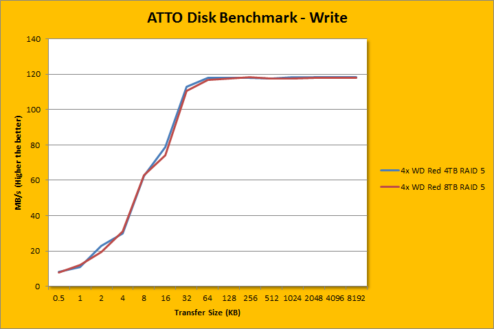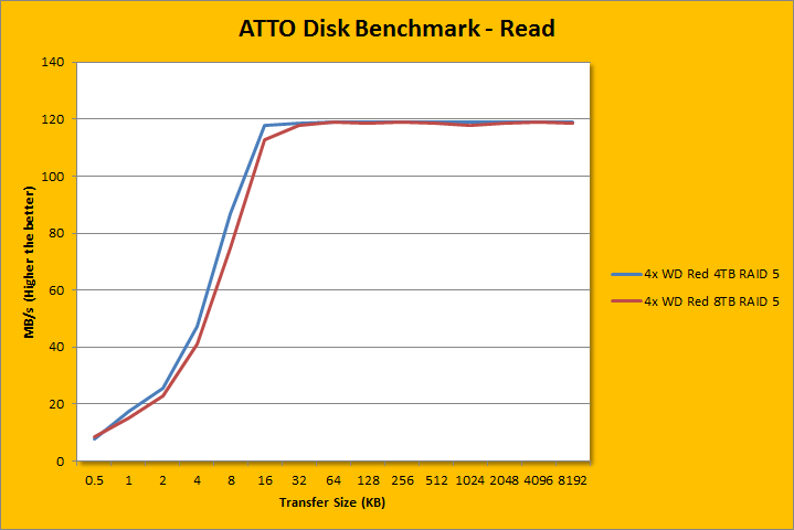 First, I tested four Western Digital Red WD80EFZX 8TB drives against four Red WD40EFRX 4TB drives, both sets in RAID 5 configuration, to see how they compare. Although the WD80EFZX is a better performing drive per our benchmarks, a slight edge was given to the WD40EFRX when deployed in our NAS when running in RAID 5, possibly due to the way the QNAP NAS controls higher capacity drives. That said, the difference was not significant at all; most of them happened during the ramp up until we became bandwidth saturated at 64K and higher.
