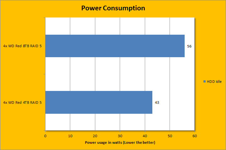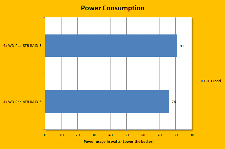 Power consumption is another big topic of concern. The QNAP TVS-473's powerful hardware under the hood made it quite a power-hungry system compared to other boxes we have tested in the past. That aside, while idling, the system configured with four 8TB drives consumed an additional 13W compared to the 4x4TB setup. However, gap lessened to only 6W while under load, thanks to the WD80EFRX's helium fill. It is important to point out the WD80EFZX is one of the most power efficient hard drives in its class per our recent tests -- so you are not going to get much better than this with regards to hard drives. You just have to pay to play for the additional capacity.
