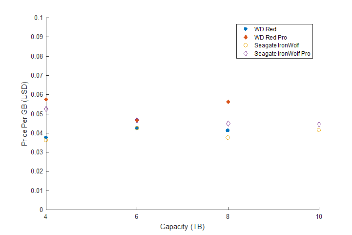 There are tons of hard drives from Western Digital and Seagate you can buy for your NAS at press time. From 4TB and up, I graphed the price per gigabyte data collected at the time of writing this article for the Red and Red Pro lineup from Western Digital and IronWolf and IronWolf Pro lineup from Seagate above. As it can be seen, you can get quite a bit of bang from your buck in the 4TB range, and we have covered the Western Digital Red, Red Pro, and Seagate NAS HDD (The IronWolf 4TB is an updated version of the NAS HDD) in the past. However, since it is 2017, and we are looking for something of a higher capacity, I considered the next sweet spot segment: The 8TB class.