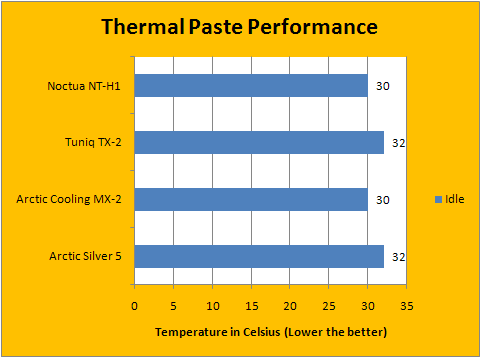 Using our Intel Pentium Dual Core E2140 running at 3.08GHz with 1.4V and our full copper Asus Silent Knight II heatsink, test results were obtained using the controlled conditions listed about. The results of all compared thermal pastes are quite comparable across the board. Arctic Silver 5 and Tuniq TX-2 managed to get recorded temperature of 32c, while the Arctic Cooling MX-2 and Noctua NT-H1 were able to bring it down two extra degrees to 30c -- besting the other two and tied each other.