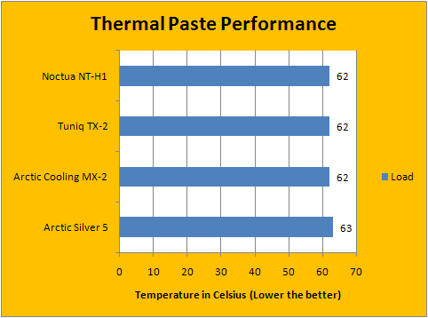 In our load tests, our results were again quite comparable -- but not necessarily the same way as before. This time, the fully synthetic pastes all managed to get a load result of 62c, while the only polysynthetic silver paste, Arctic Silver 5, recorded a degree higher in our results of 63c. Arctic Silver 5, once the king of all thermal pastes and seems to be so invulnerable to challenges, is beaten by everyone else. It's interesting how history works.