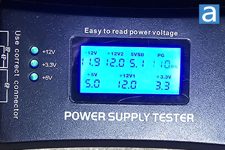Voltages with minimal load are accurate, which is a basic requirement of power supplies out of the box. The ATX design specifications state a PSU's PG is required to be between 100ms and 500ms, with 250ms maximum for Non-Alternative Sleep Mode and 150ms for Alternative Sleep Mode. This power supply is ATX 3.0 compliant and officially supports Alternative Sleep Mode with 100 to 150ms PG specifications. The tested result was 110ms per my power supply tester, which is within specifications.