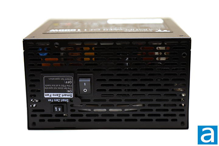 Starting from the back part of the power supply, we have the slit pattern grille design as aforementioned; what you will find here is a horizontally aligned male connector for power input on the western edge along with an on/off switch and another rocker switch to toggle Smart Zero Fan next to it. I find having the Smart Zero Fan switch here to be convenient, since some older power supplies have it on the inside rather than the outside. However, I do not see a reason why you will not leave Smart Zero Fan on. Smart Zero Fan keeps the fan off until it exceeds about 30% of the load threshold. Disabling Smart Zero Fan ensures the fan stays on at all times, but the Thermaltake Toughpower GF1 1000W is intelligently designed to keep it from overheating regardless of what the active setting is.