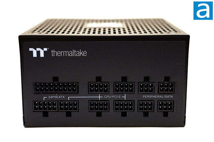 The rear cable connection panel is done nicely. Thermaltake has made the labels upside-down in standard orientation. Similar connectors are grouped together and are laid out in a very logical manner. To ensure you know what is going on, they are all grouped and clearly labeled for minimal ambiguity. Starting from the left, we have a motherboard 24-pin split into two blocks on top of each other. Immediately below and to the right of that are five ATX/EPS 4+4 pin or PCI Express connectors. Finally, there are four peripheral headers for Molex and SATA peripherals. Incompatible outputs will not physically fit into each other, so Thermaltake has done a great job in this regard. This is a reasonable array of outputs in correspondence number of connectors on each modular cable, which should be sufficient for casual users and power enthusiasts alike.