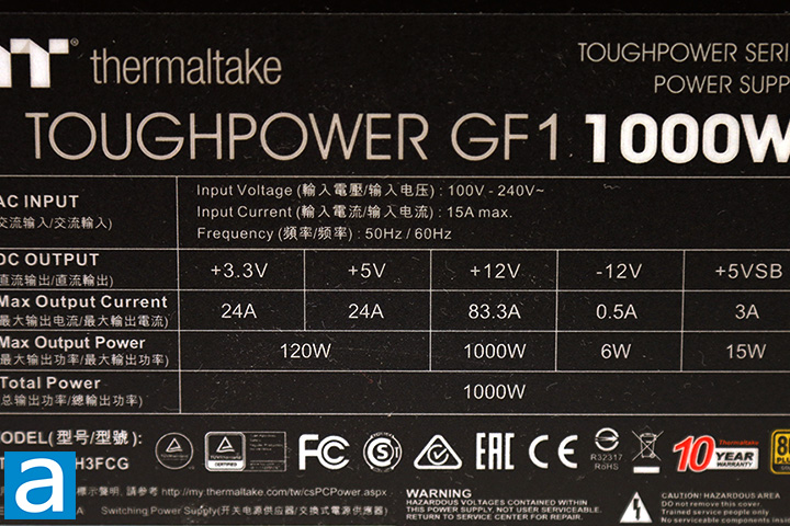 The voltage specification label is located on the top panel of the Toughpower GF1 1000W. There are two main virtual rails. Up to 24A can be delivered via the +3.3V rail for a total of 79.2W, while the 24A on the +5V rail brings the output to 120W in this area. The total combined output for the +3.3V and +5V rail is 120W. In other words, your power allocation combination must fall within the limits of the listed specifications. Meanwhile, a single powerful +12V rail delivers up to 83.3A -- 1000W -- to maximize power delivery flexibility compared to multiple rails. Overall, the combined power output for the whole Thermaltake Toughpower GF1 1000W is... well, 1000W haha. It does sound a bit confusing to understand how this works at first, but generally speaking, this configuration allows sufficiently flexible power demands and should be sufficient to accommodate most users. I have seen lower power outputs in the +3.3V and 5V rails for higher output rated units. The overall distribution is very reasonable for a 1000W power supply.