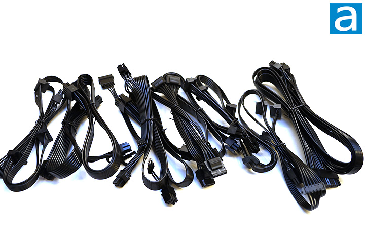 A total of ten modular cables are included out of the box. All modular cables are flat and easy to bend, making them extremely easy to work with. The wires are not labeled, but from a visual inspection, it looks like the high current PCI Express and ATX/EPS connectors are 16 AWG with the rest 18 AWG. Manufacturers often will fatten high current cables to 16 AWG, so this is common practice.