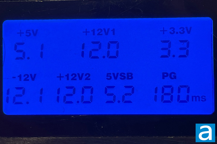 Voltages with minimal load are generally accurate, which is a basic requirement of power supplies out of the box. In this situation all are within 4%. The Power Good or PG delay is tested at 180ms, which is compatible with Non-Alternative Sleep Mode per ATX specifications. The ATX design specifications state a PSU's PG is required to be between 100ms and 500ms, with 250ms maximum for Non-Alternative Sleep Mode and 150ms for Alternative Sleep Mode.