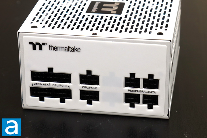 As for the rear cable connection panel, everything is clearly labeled and in the correct orientation. Similar connectors are grouped together and laid out in a logical manner. Starting from the left, we have a motherboard 24-pin split into two blocks on top of each other. Immediately below and to the right of that are three ATX/EPS 4+4 pin or PCI Express connectors. There is a notable divide in between this grouping and the four peripheral headers for Molex and SATA peripherals. You can see this divide actually has two more holes covered by a white label, which indicates this enclosure is probably used across all of the Toughpower GF1 lineup. Incompatible outputs will not physically fit into each other, so Thermaltake has done an excellent job in this regard. This is a generally reasonable array of outputs in correspondence to the number of connectors on each modular cable, which should be sufficient for most users.