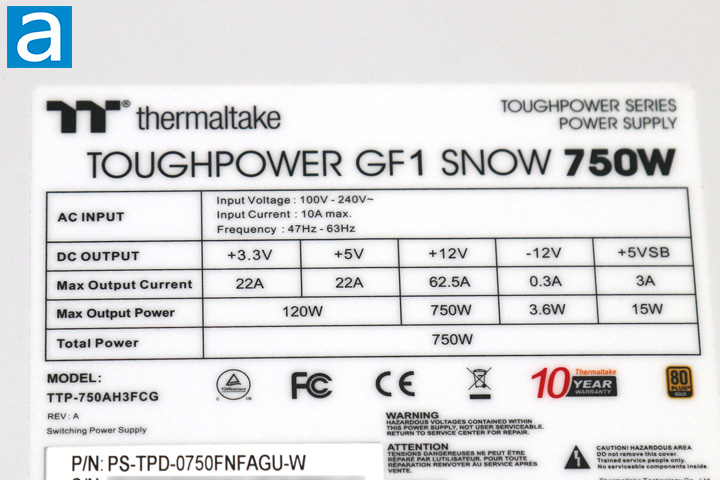 The voltage specification label is located on the outer panel of the Thermaltake Toughpower GF1 Snow 750W. There are two main virtual rails. Up to 22A can be delivered via the +3.3V rail for a total of 72.6W, while the 22A on the +5V rail brings the output to 110W in this area. The total combined output for the +3.3V and +5V rail is 120W. In other words, your power allocation combination must fall within the limits of the listed specifications. Meanwhile, a single powerful +12V rail delivers up to 62.5A, or 750W, to reduce operating overhead compared to multiple +12V rails. Overall, the combined power output for the whole Thermaltake Toughpower GF1 Snow 750W is an unsurprising 750W. It does sound a bit confusing to understand how this works at first, but generally speaking, this configuration allows fairly flexible power demands and should be sufficient to accommodate most users. I have seen lower power outputs in the +3.3V and 5V rails for higher output rated units, so the overall distribution is more than reasonable for an 750W power supply.