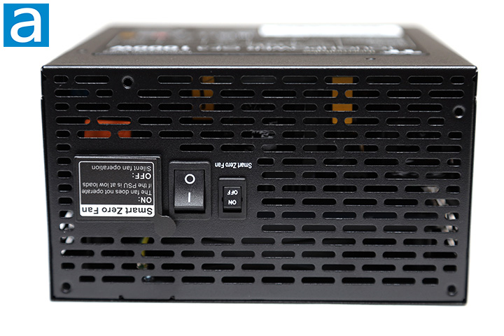 Starting from the back part of the power supply, we have the slit pattern grille design as aforementioned. What you will find here is a horizontally aligned male connector for power input on the western edge along with an on/off switch and another rocker switch to toggle Smart Zero Fan next to it. I find having the Smart Zero Fan switch here to be convenient, since some older power supplies have it on the inside rather than the outside. However, I do not see a reason why you will disable Smart Zero Fan. Smart Zero Fan keeps the fan off until it exceeds about 30% of the load threshold. Disabling Smart Zero Fan ensures the fan stays on at all times, but the Thermaltake Toughpower GF3 1000W is intelligently designed to keep it from overheating regardless of what the active setting is.