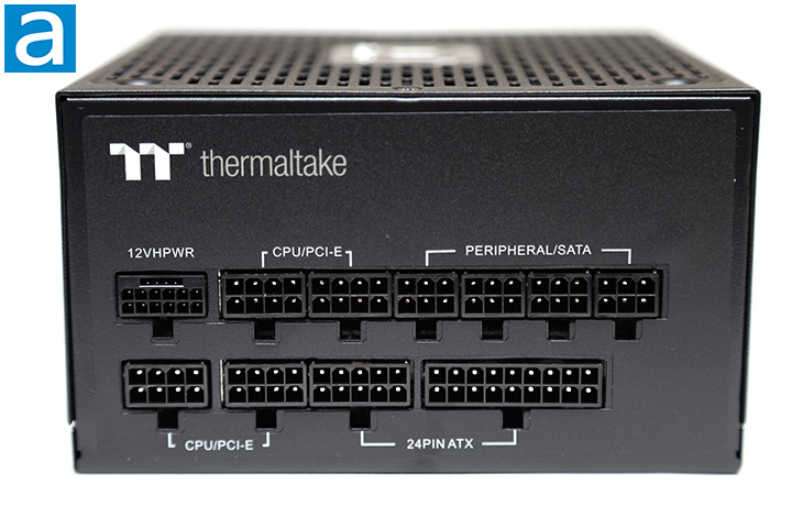The rear cable connection panel is done nicely. Thermaltake has made the labels upside-down in standard orientation. Similar connectors are grouped together and are laid out in a very logical manner. To ensure you know what is going on, they are all grouped and clearly labeled for minimal ambiguity. Starting from the top left, we have the new 16-pin 450W 12VHPWR PCIe 5.0 header, two ATX/EPS 4+4 pin or PCI Express connectors, four peripheral outputs for Molex and SATA peripherals, two more ATX/EPS 4+4 pin or PCI Express connectors, and two motherboard 24-pin split into two blocks next to each other. Incompatible outputs will not physically fit into each other, so Thermaltake has done a great job in this regard. This order and configuration are different than the Toughpower GF1. This is a reasonable array of outputs in correspondence number of connectors on each modular cable, which should be sufficient for casual users and power enthusiasts alike.