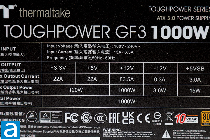 The voltage specification label is located on the top panel of the Toughpower GF3 1000W. There are two main virtual rails. Up to 22A can be delivered via the +3.3V rail for a total of 72.6W, while the 22A on the +5V rail brings the output to 110W in this area. The total combined output for the +3.3V and +5V rail is 120W. In other words, your power allocation combination must fall within the limits of the listed specifications. Meanwhile, a single powerful +12V rail delivers up to 83.5A -- 1000W -- to maximize power delivery flexibility compared to multiple rails. Overall, the combined power output for the whole Thermaltake Toughpower GF3 1000W is... well, 1000W, haha. It does sound a bit confusing to understand how this works at first, but generally speaking, this configuration allows sufficiently flexible power demands and should be sufficient to accommodate most users. I have seen higher power outputs in the +3.3V and 5V rails for similar rated units including its predecessor, the Toughpower GF1 1000W, and the Antec Signature Platinum 1000W, but the overall distribution is still reasonable for a 1000W power supply.
