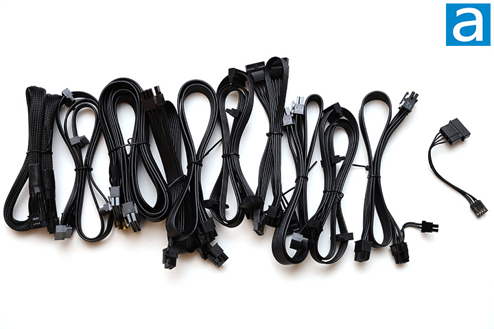 A total of ten modular cables are included out of the box. The 12VHPWR is braided, while the rest of the modular cables are flat and easy to bend, making them extremely easy to work with. The wires are not labeled, but from a visual inspection, it looks like the high current PCI Express and ATX/EPS connectors are 16 AWG with the rest 18 AWG. Manufacturers often will fatten high current cables to 16 AWG, so this is common practice.